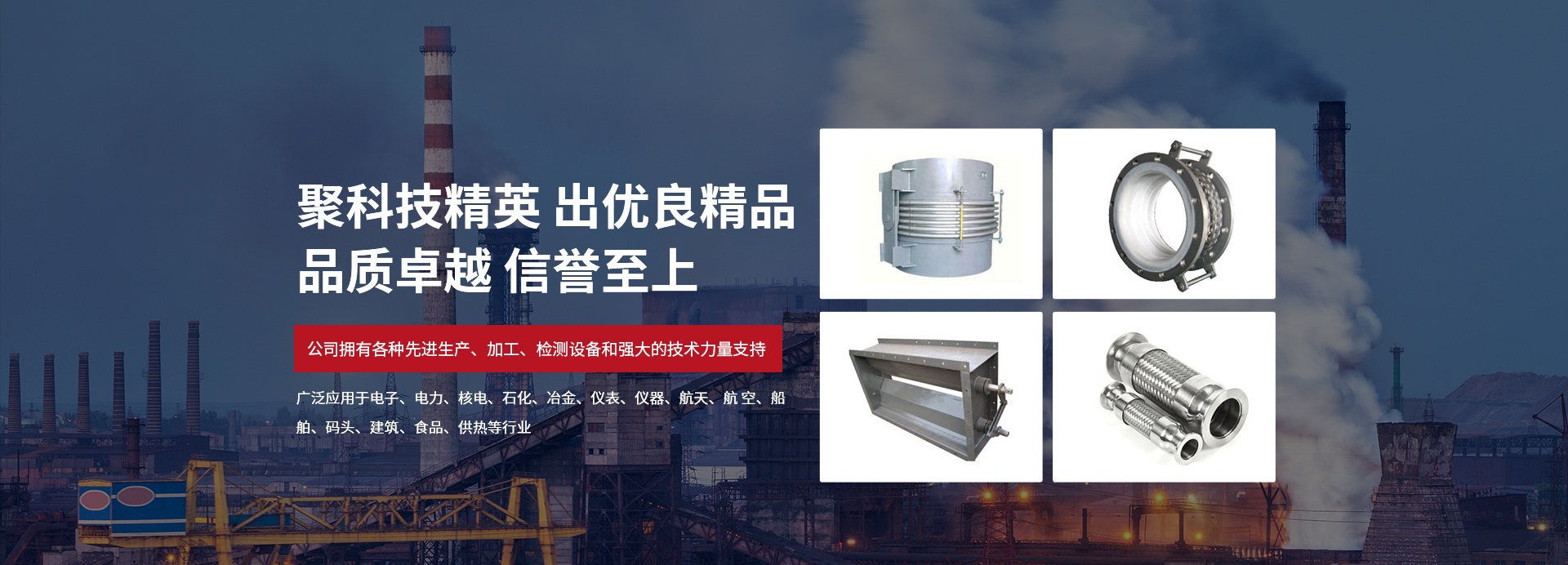 產品廣泛應用于電子、電力、核電、石化、冶金、儀表、儀器、航天、航 空、船舶、碼頭、建筑、食品、供執管等行業,先后為數百家大型企業提供各種型號的優質補償器。